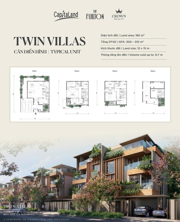 Dòng sản phẩm Biệt thự Tứ lập Fullton có diện tích đất 150m2 xây dựng 4 tầng, thiết kế đương đại rất hiện đại, không gian thoáng mở giao hòa với thiên nhiên mang đến chất sống khỏe, sinh thái cho cư dân.