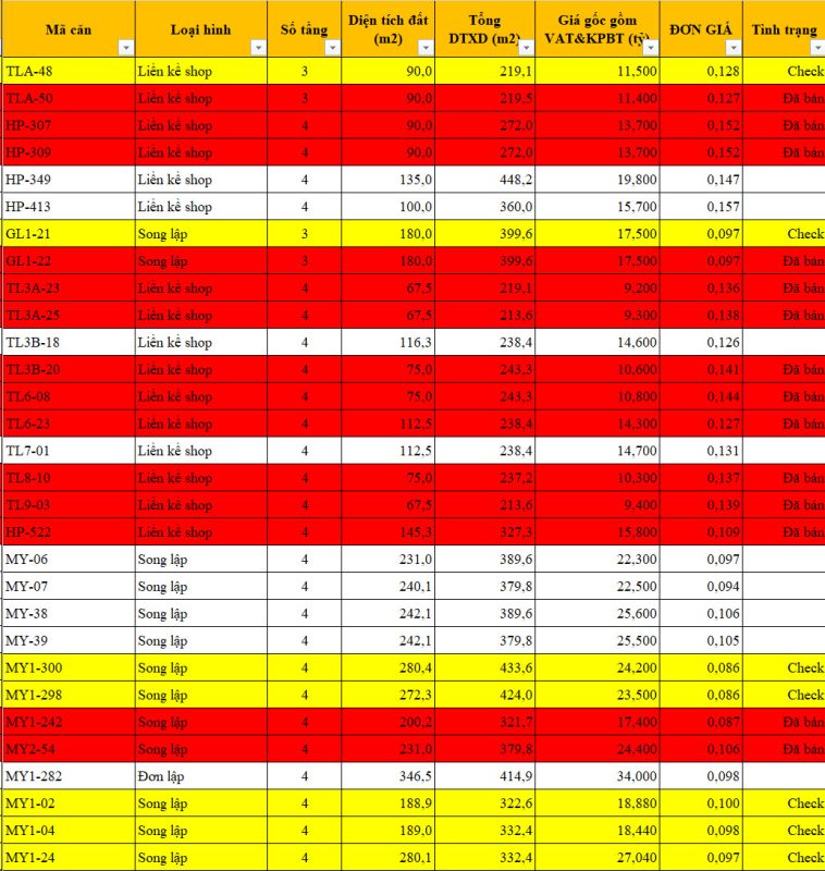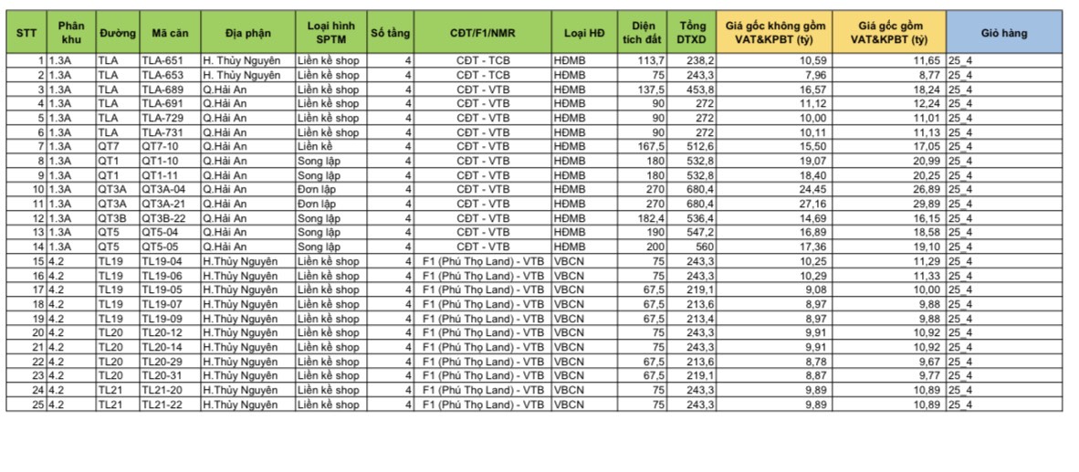 Tóm tắt giá bán đợt 1 như sau: