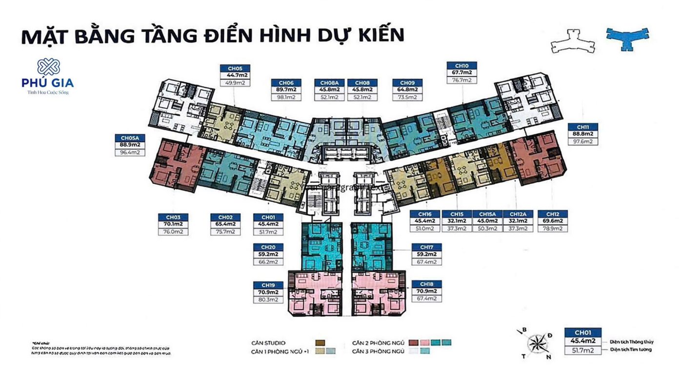 Mặt bằng Layout thiết kế có 20 căn hộ 1 sàn, mỗi toà có 9 thang máy, có 5 loại hình căn hộ như sau: