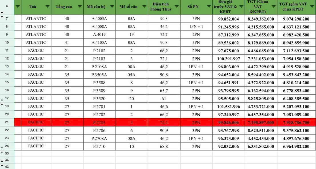 Với mức giá Rumor từ 79tr/m2 (chưa VAT), giá bán căn hộ có mức giá tương ứng như sau: