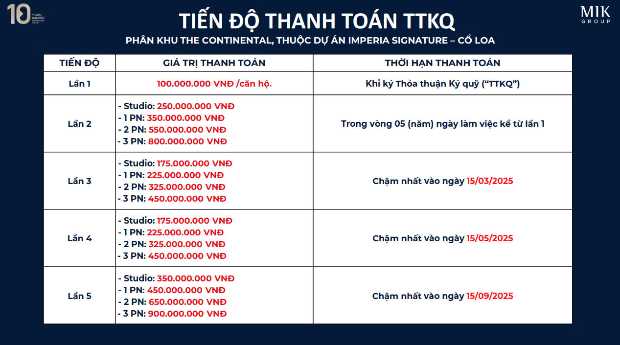 Câu hỏi em được khách hàng hỏi nhiều nhất đó là tiến độ đóng tiền như thế nào? sau đây là chính sách bán hàng mà chủ đầu tư MIK Group đã công bố: