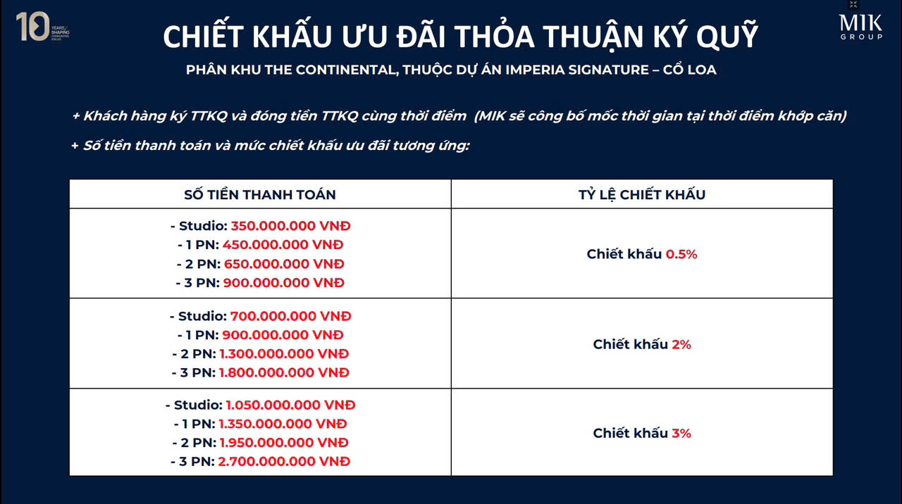 Chủ đầu tư MIK Group chơi lớn mở bán 2 toà Imperia Cổ Loa đầu tiên có tên gọi The Continental với giá bán Rumor chỉ từ 79tr/m2 (chưa VAT & KPBT). Anh chị có thể mua để đầu tư, sở hữu bất động sản hàng hiệu, cho thuê khai thác dòng tiền tại thành phố thương mại quốc tế sôi động với điểm đến nổi bật như Trung tâm triểm lãm quốc gia The Grand Expro, Phố thương mại Grand World, Vincom Mega Mall…