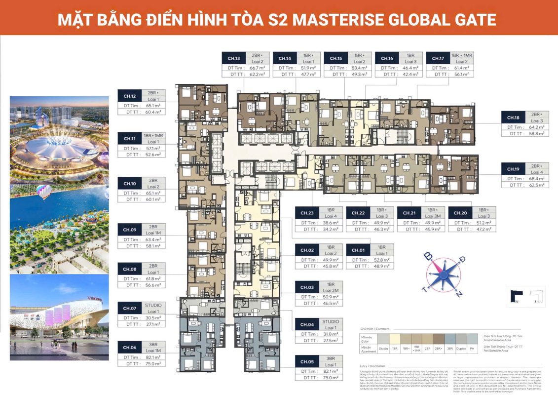 Toà S1 mặt bằng thiết kế căn hộ tương tự như toà S2: 23 căn/sàn, có 11 thang máy, chỉ khác nhau về mã số căn hộ, còn lại Layout căn hộ và diện tích căn hộ giống nhau.