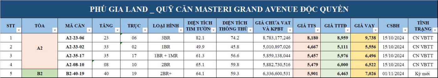 Đơn giá chung cư Masteri Grand Avenue thanh toán sớm trung bình từ 97-103tr/m2.