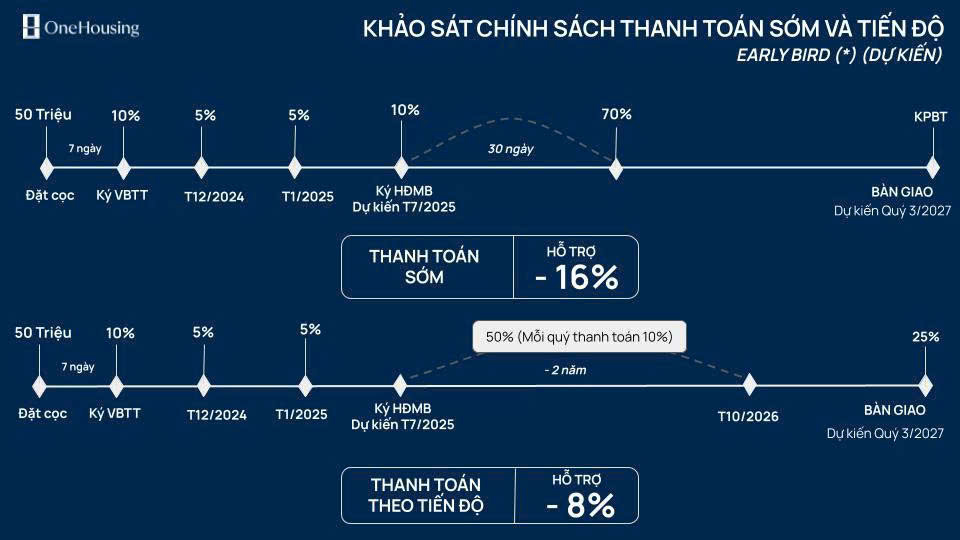 - Phương án thanh toán sớm: Chiết khấu lên đến 16%, thanh toán sau khi ký HĐMB 30 ngày (dự kiến tháng 7/2025 ký HĐ)
