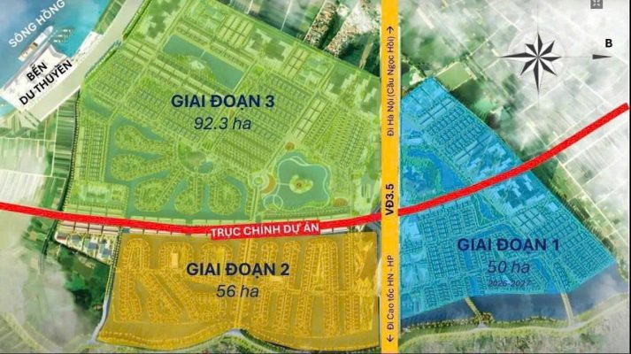 - Giai đoạn 3 quy mô 92,3ha: Sản phẩm có thấp tầng và cao tầng, thêm bến du thuyền ven sông Hồng
