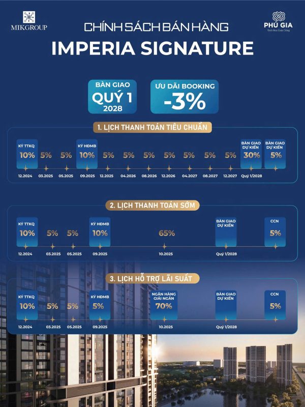 Giá căn hộ Imperia Signature chỉ từ 79tr/m (chưa VAT), một mức giá quá hấp dẫn so với những giá trị của căn hộ mang lại. Giá bán này sẽ thuyết phục được các NĐT đầu tư xuống tiền Booking mua ngay.