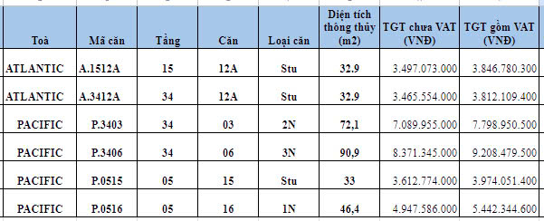 Tổng giá bán all in các loại căn hộ có khoảng giá như sau:
